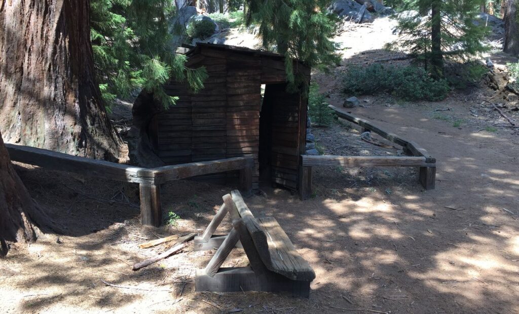 Odtiaľ sme sa vybrali ku zbytku zaujímavostí. Plán je navštíviť tzv. Polmesiacovú lúku (Crescent Meadow) v ktorej blízkosti je chata Hale Tharpa, strom komín a ide sa k nej cez strom tunel. Ten posledný menovaný sme našli ľahko, prešli sme autom cez tento tunel (strom spadol a najjednoduchšie bolo v ňom vyíliť tunel, nemiesto odpratania z cesty). Zaparkovali sme a šli k lúke. Vybrali sme si lesnú cestičku, nepôjdeme predsa po asfaltke. Zdalo sa nám že už ideme príliš dlho a keď sme videli medvedie exkrementy, otočili sme sa. Ďalej sme pre istotu nešli.