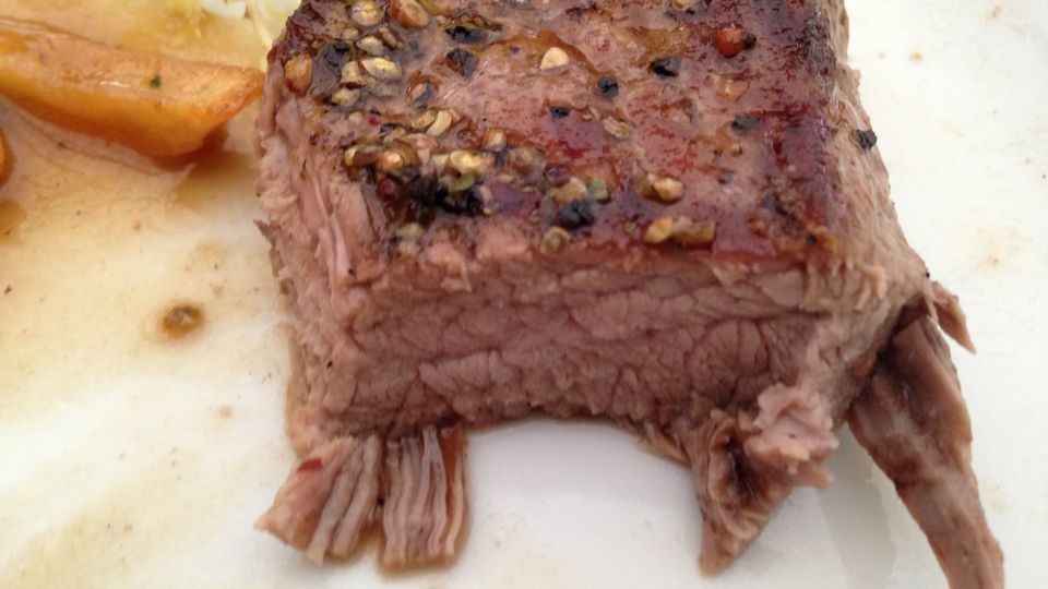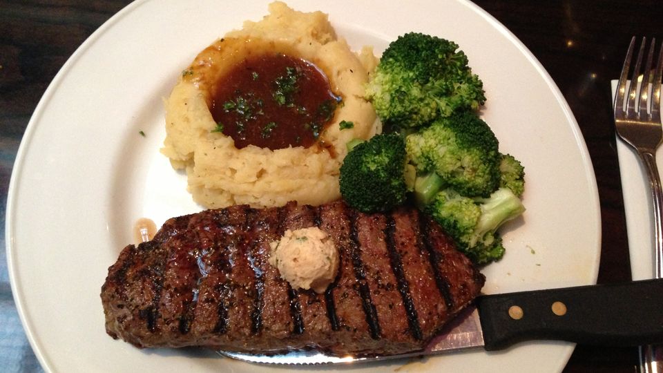 Obsluha perfektná (chlapec z Rumunska, šikovný), nápoje super, jedlo na výbornú. Predjedlo – jednu porciu, sme si dali všetci štyria. Potom nasledoval New York strip steak – 340g, zo stredu krájaný, 21 dní odležaný, pripravený podľa želania (medium-rare) a s Merlot cesnakovým maslom. Taký výnimočne chutný kus hovädzieho som ešte v živote nejedol. Výsledok na jednotku s hviezdičkou. Mínusom snáď bolo poznanie, že pre jemnejšie pohlavie nedoporučujem predjedlo. Žiadne. Nejedia potom hlavný chod.