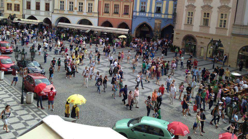 A potom priamo na „Staromák“ k orloju. Zakúpili sme si lístky, dokonca kombinované do veže, sálov a podzemia. Ľúto mi bolo turistov čo stáli pred nami a keď prišli po 15 minútach na rad, predavač ich otočil lebo chceli platiť € a nie CZK. Bolo mi to trápne a keby som mal zvyšné CZK tak by som im tie lístky kúpil. Ak chcete vidieť Staroměstké náměstí z vtáčej perspektívy, pripravte si české koruny.