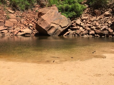 Potom sme sa zviezli na zastávku The Grotto. Odtiaľ sme sa prešli krásnym chodníkom Kayenta Trail ku smaragdovým jazierkam a od nich do Zion Lodge. Krásna asi 2 hodinová prechádzka. Doporučujem, nie je to náročné, treba si zobrať so sebou vodu.